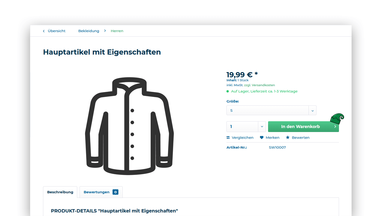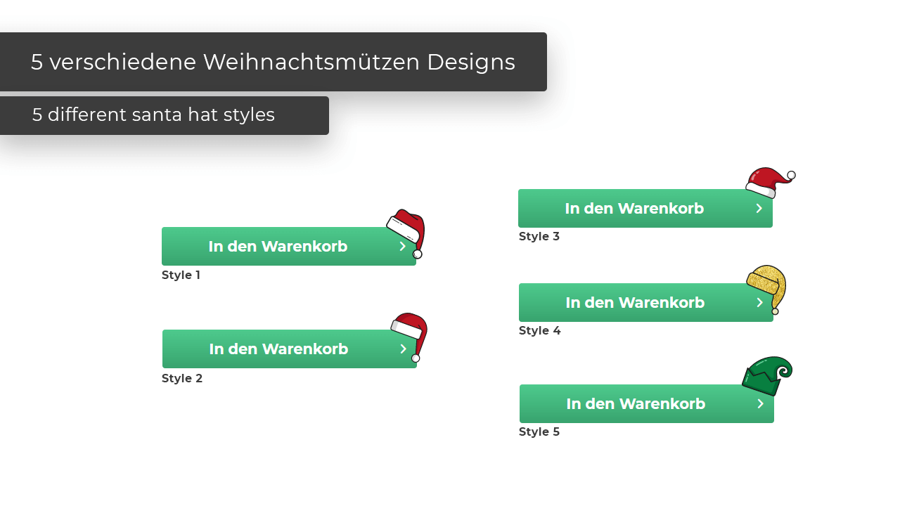 Durch das Plugin wird eine von 5 verschiedenen Weihnachtsmützen auf dem Warenkorb-Button auf der Produktseite in deinem Shop angezeigt.