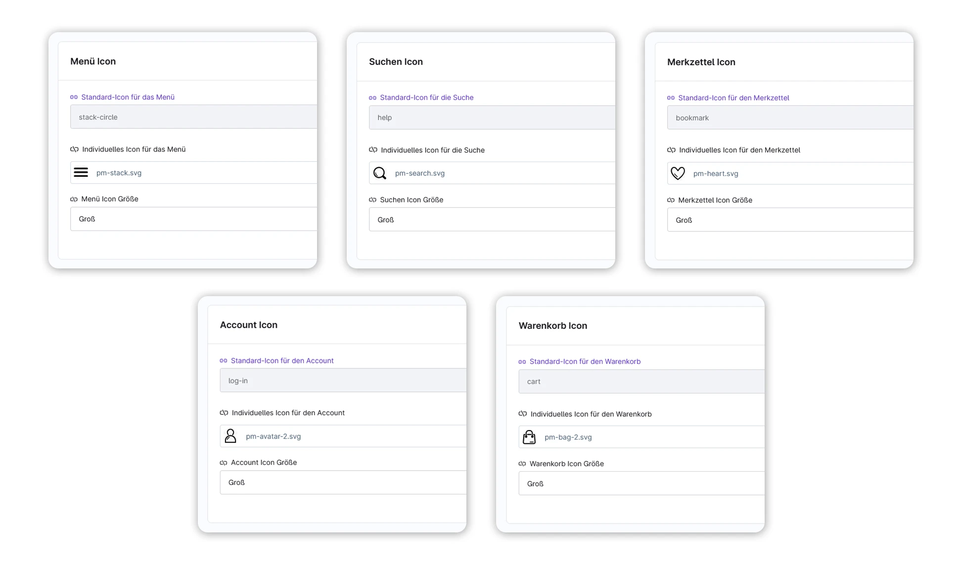 - Upload eigener Icons (z. B. SVG oder PNG)