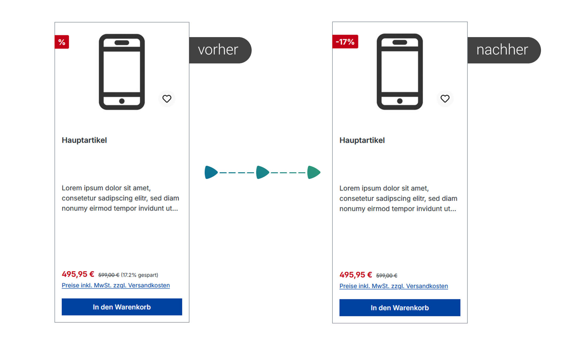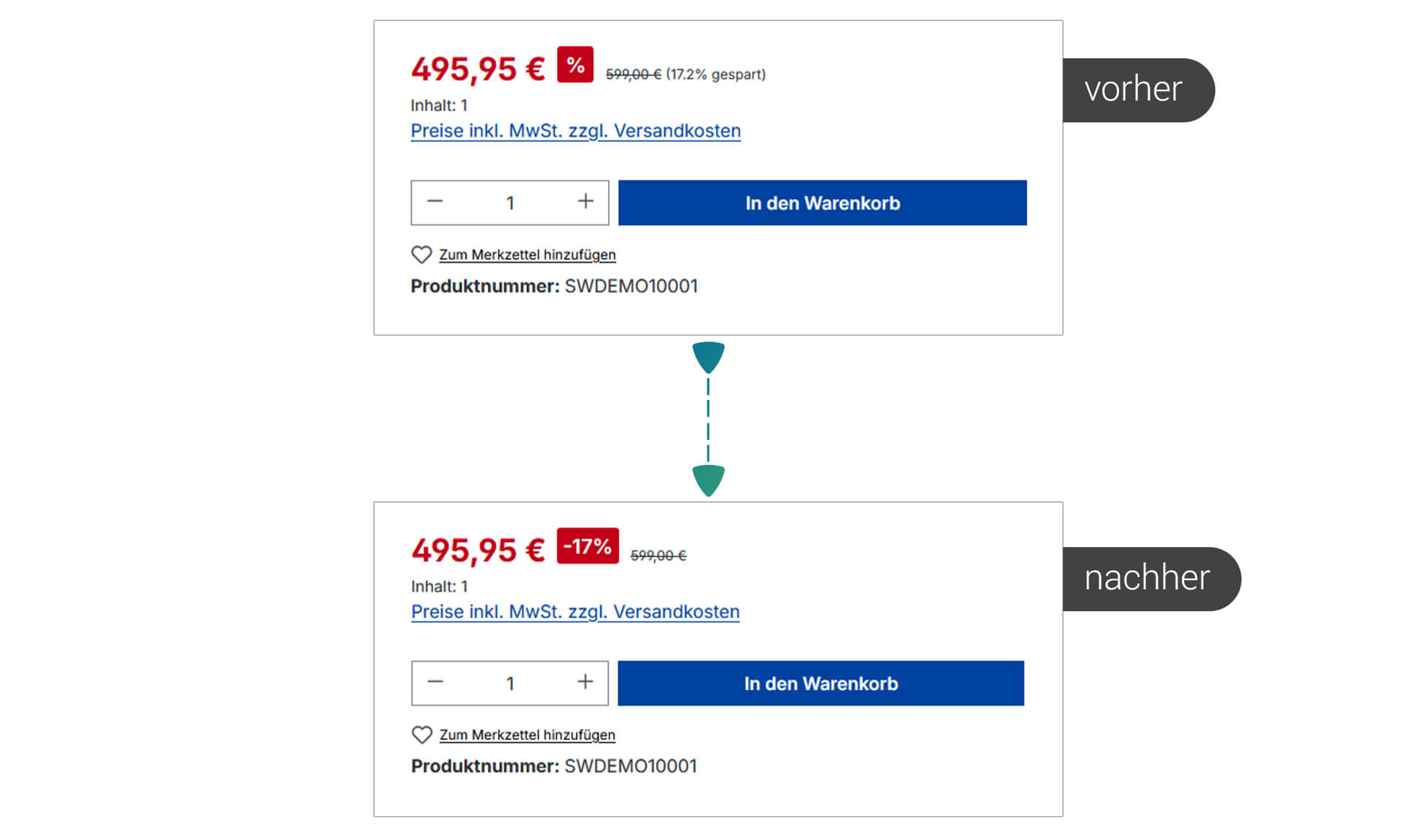 Dieses Plugin sorgt dafür, dass stattdessen der tatsächlich gerundete prozentuale Rabatt sichtbar gemacht wird – sowohl im Listing als auch auf der Produktdetailseite.