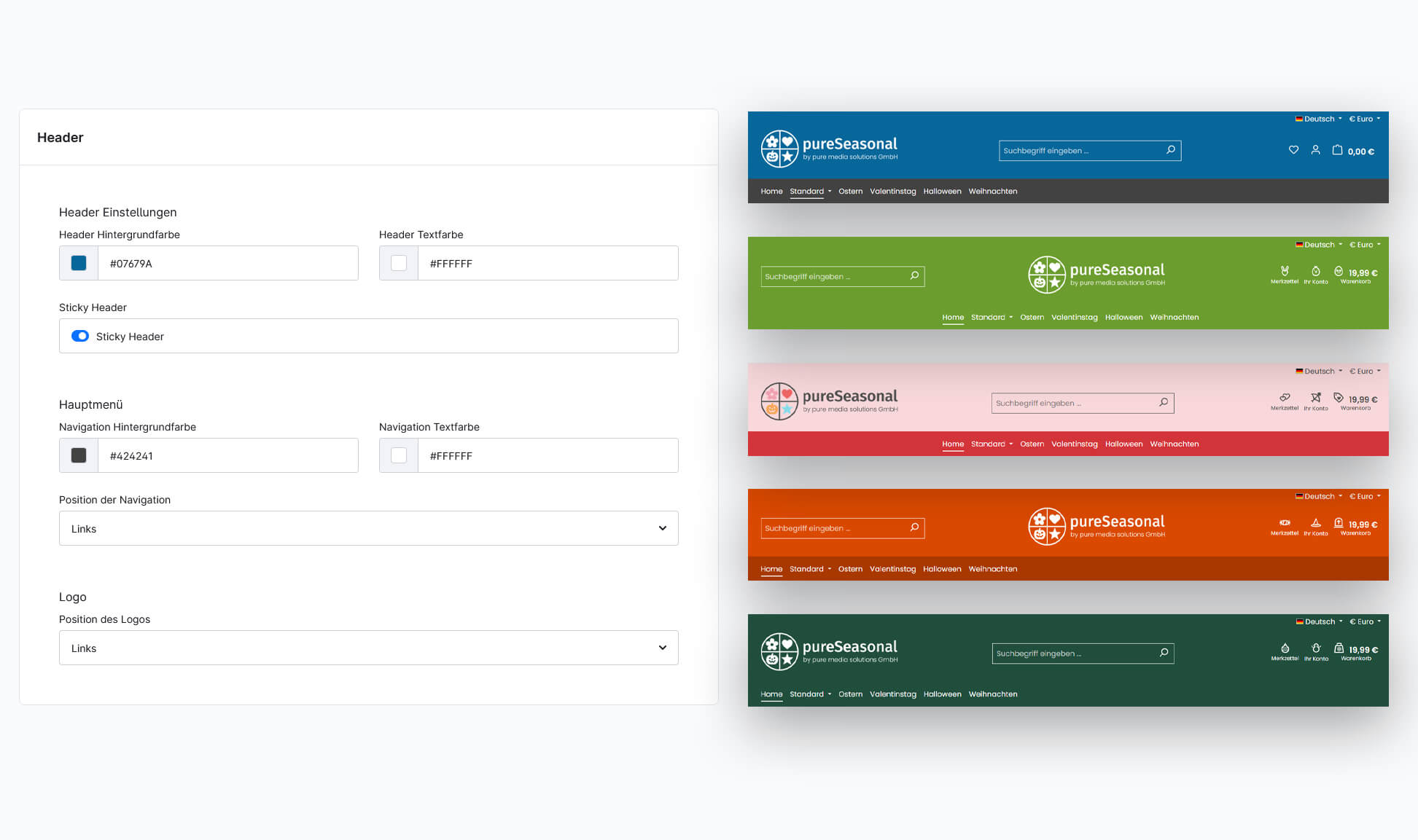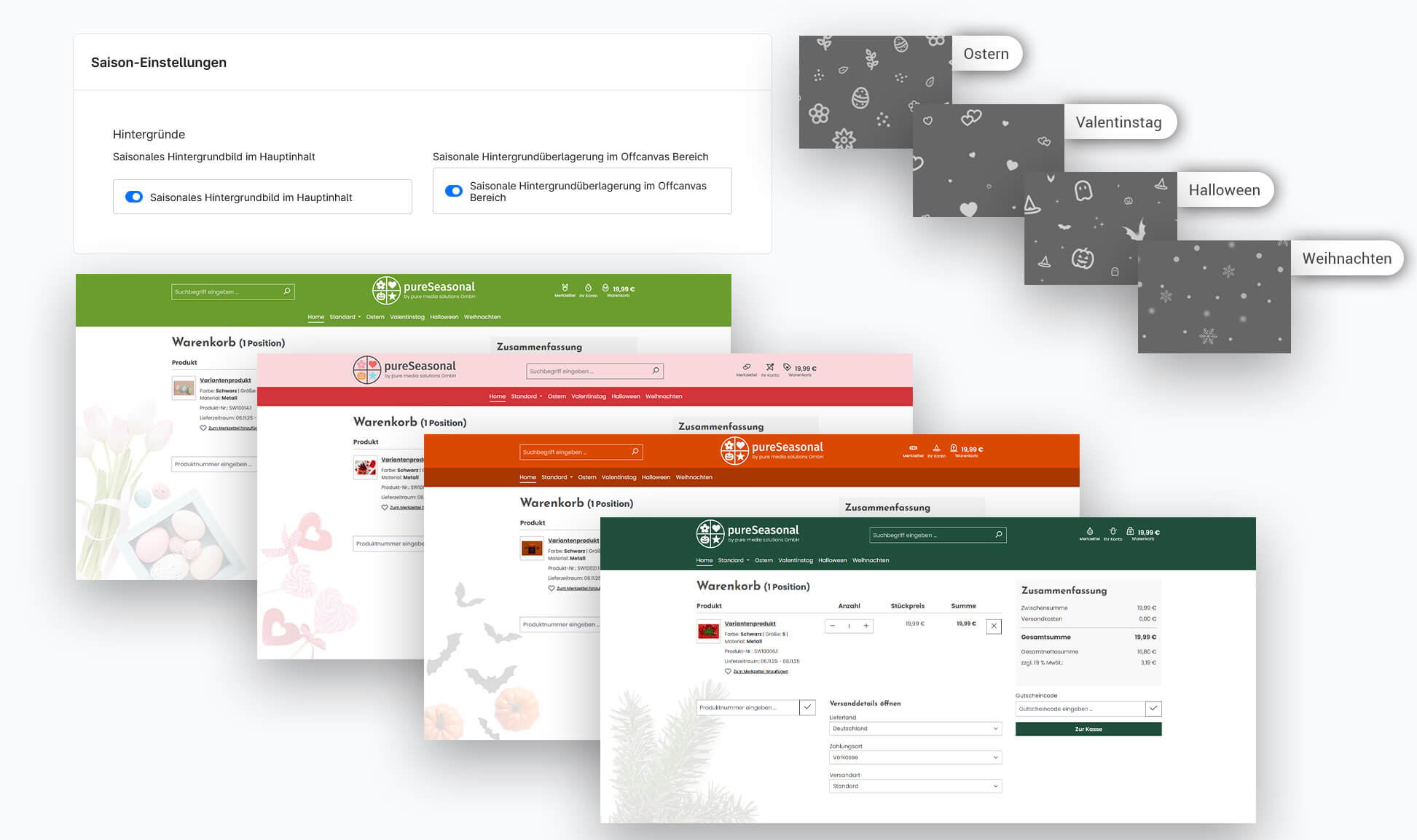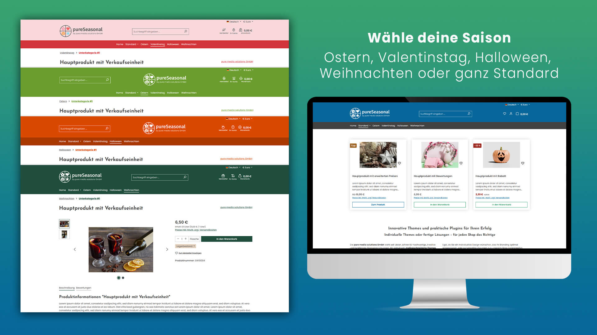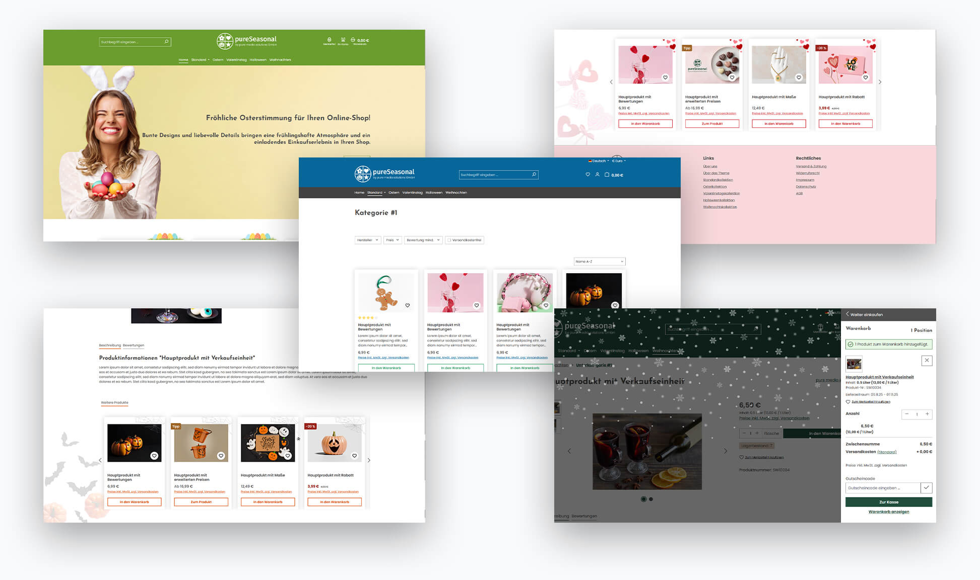 Das PureSeasonal-Shopware-Theme bietet maximale Flexibilität und modernes Design für alle Jahreszeiten. Gestalte Farben, Icons und Layouts individuell nach deinem Branding und wechsel mühelos zwischen saisonalen Looks wie Ostern, Weihnachten, Halloween oder Valentinstag.