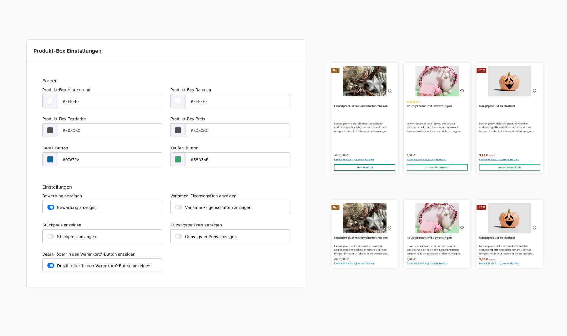 - Anpassbare Farben und Layouts für die Produktboxen